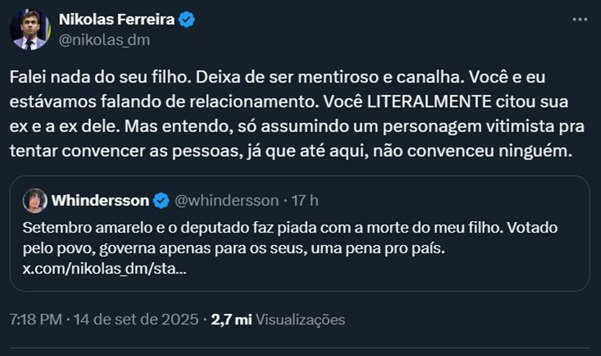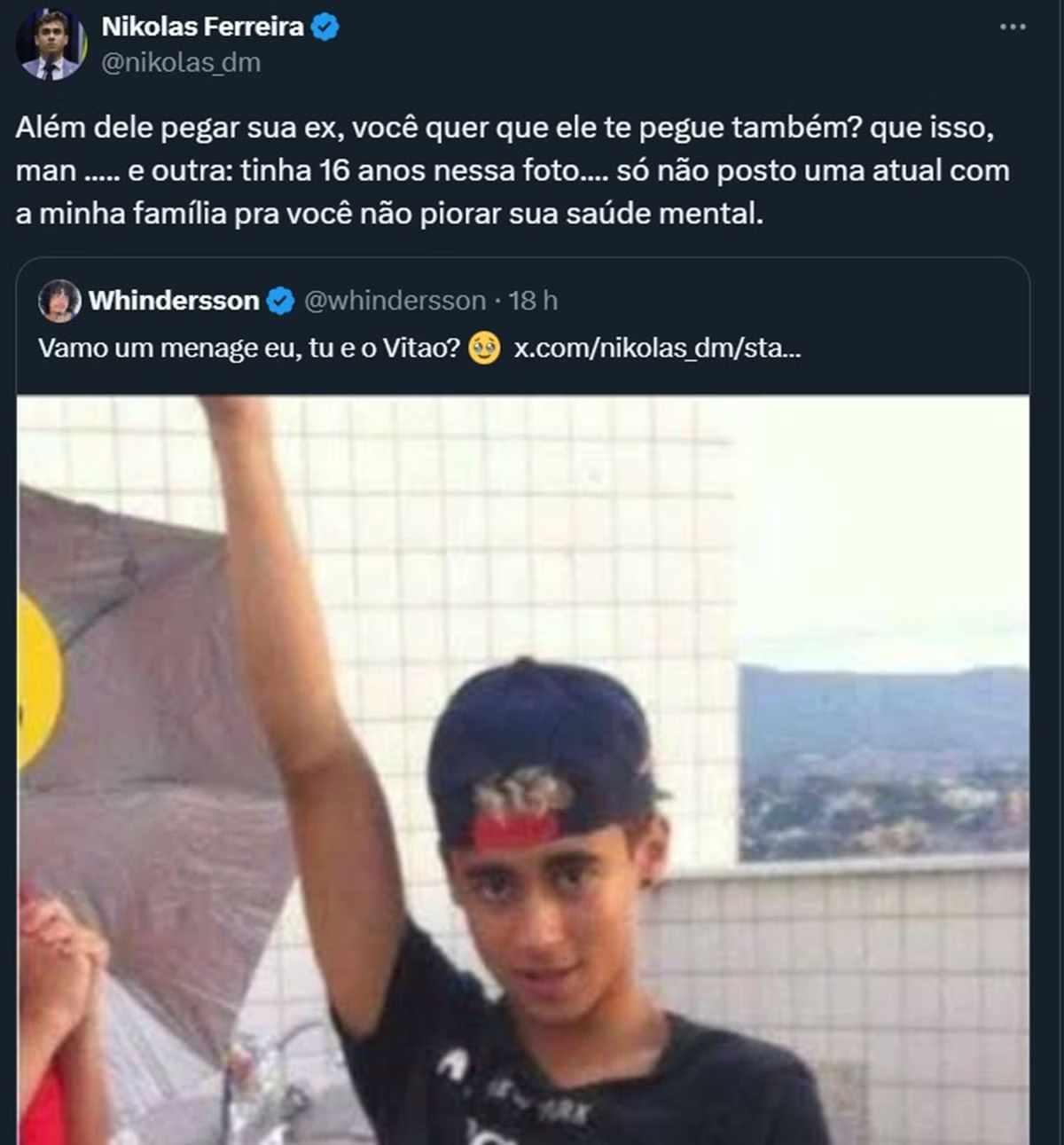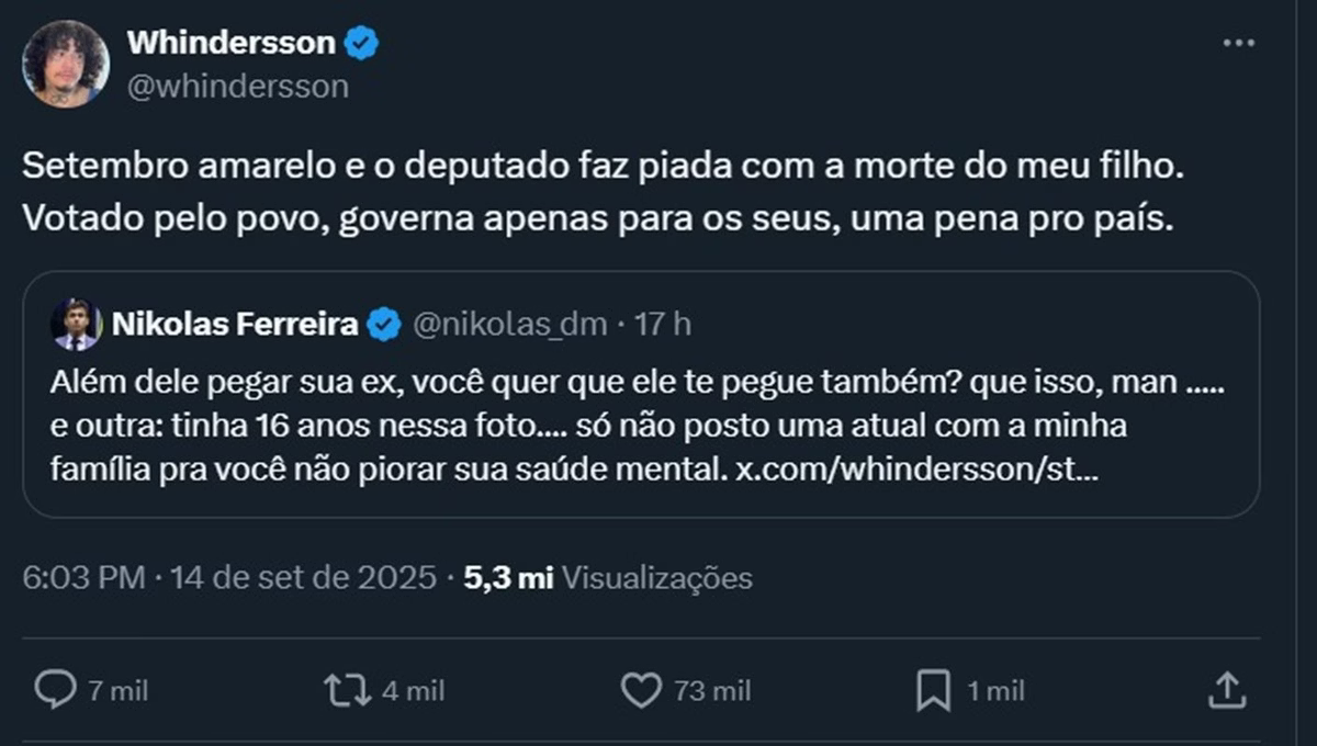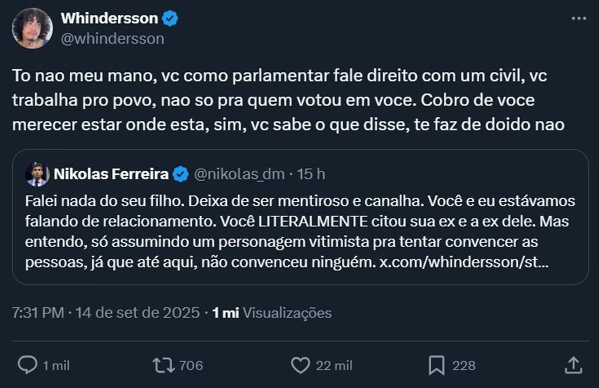 A imagem foi levada ao X (antigo Twitter), por seguidores de Whindersson, que detonaram o registro com Nikolas Ferreira. “E já foi mamar o cara que te humilhou a semana toda no Twitter e na mesma semana votou pra proteger político bandido”, disse o usuário.