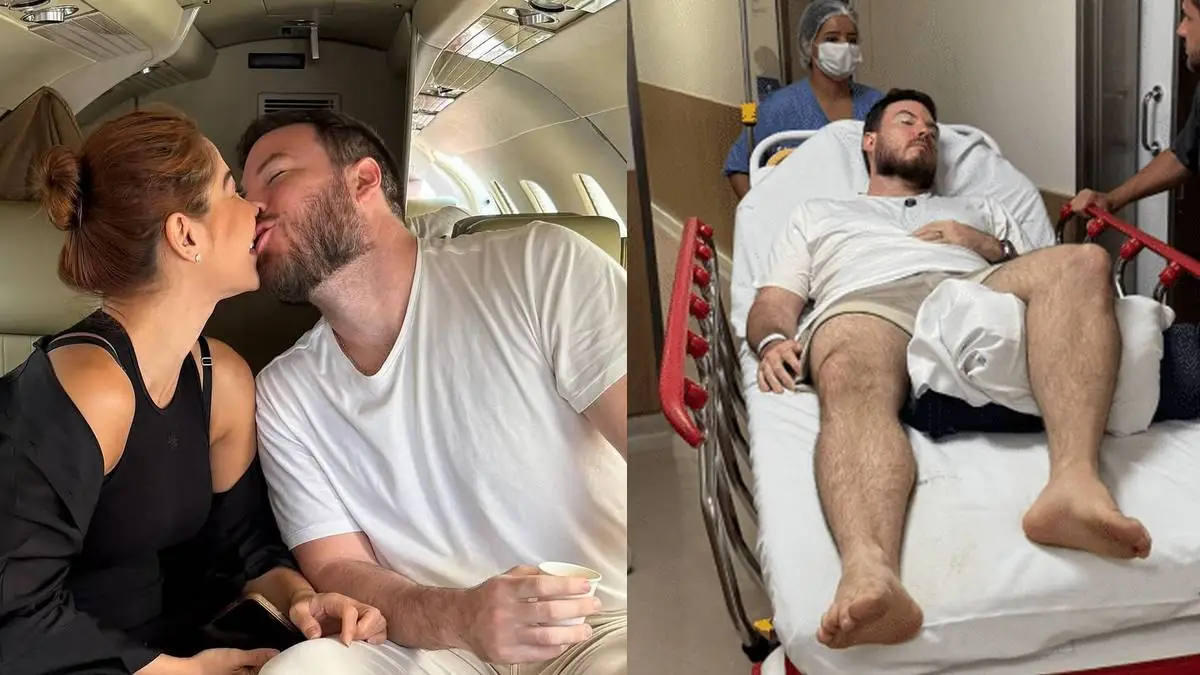 “Laudo do noivo: está todo enfaixado e terá que operar! Mas, em nome de Jesus, eu creio em um Deus de milagres e vamos mudar esse quadro”, declarou Maíra Cardi. Na imagem, o Primo Rico surge com a perna esquerda enfaixada da coxa até a canela.