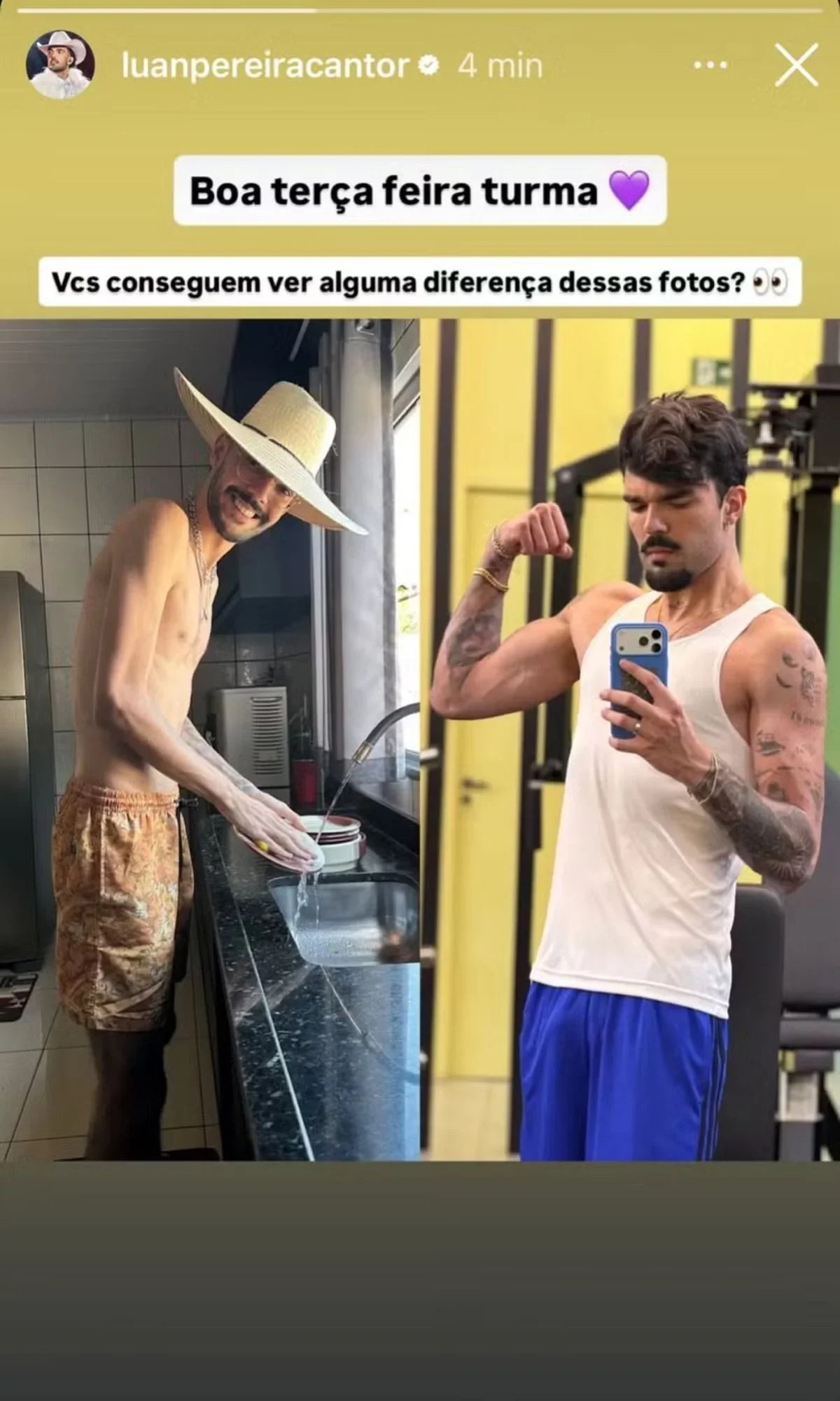 O cantor Luan Pereira, de 22 anos, surpreendeu seus seguidores nesta terça-feira (25) ao compartilhar nas redes sociais um antes e depois de sua transformação física. Nas imagens, ele aparece visivelmente mais forte e definido, resultado de mudanças em seus hábitos e cuidados com o corpo. “Vocês conseguem ver alguma diferença nessas fotos?”, provocou o artista em sua publicação.