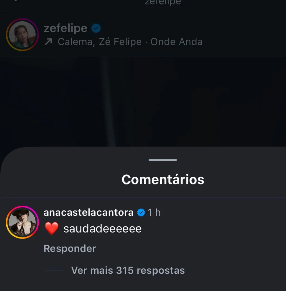 A cantora Ana Castela demonstrou publicamente o quanto sente falta do namorado, o cantor Zé Felipe, que está em Portugal a trabalho. Na última terça-feira (2/12), Zé Felipe compartilhou em suas redes sociais uma série de fotos visitando pontos turísticos do país europeu, acompanhadas de selfies. Em uma das imagens, Ana Castela deixou um comentário carinhoso: “Saudadeeee”, que rapidamente ultrapassou sete mil curtidas em pouco mais de uma hora.